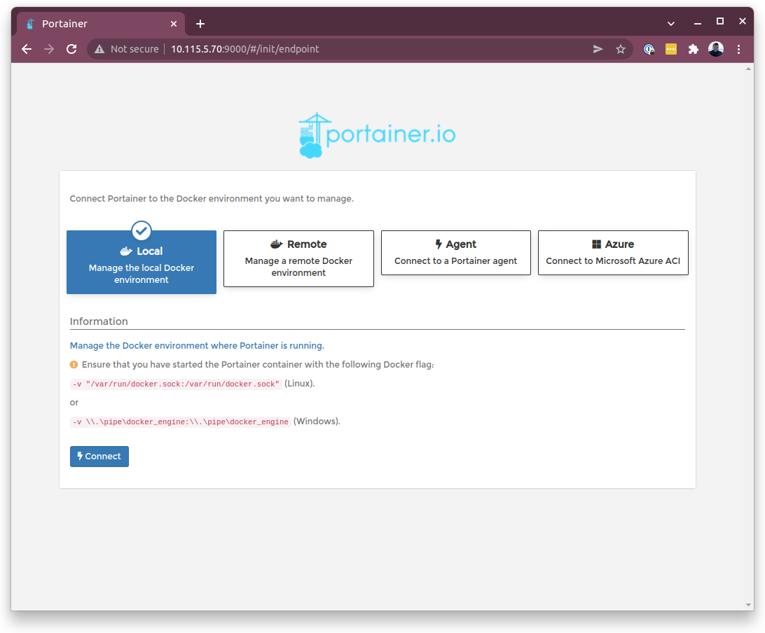 In a web browser, enter the Portainer IP address from the previous step followed by the Portainer port, 9000, like this: “